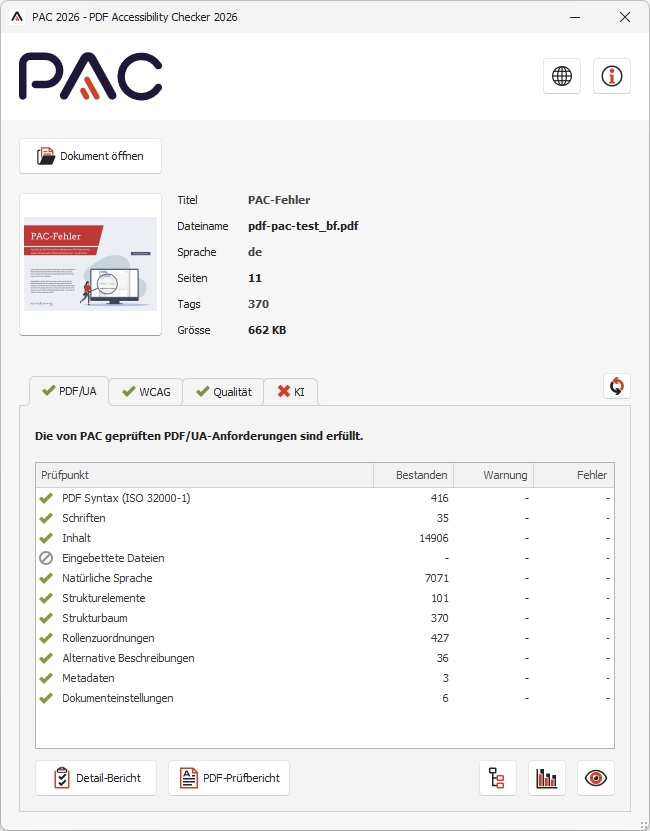 Der PDF Accessibility Checker (PAC) ist ein automatisches Prüfwerkzeug zur Bewertung von PDF-Dokumenten anhand maschinell prüfbarer Kriterien der Barrierefreiheit. Er prüft insbesondere technische Anforderungen des PDF/UA-Standards sowie ausgewählte Aspekte der EN 301 549, etwa Tags, Struktur, Metadaten, Sprachangaben und das Vorhandensein von Alternativtexten. PAC ist ein formaler Prüfer, kein vollständiger Barrierefreiheitstest.